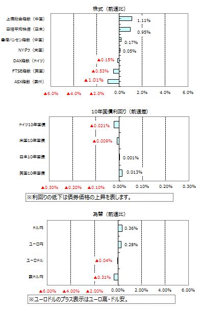 米国の10年国債利回りは横ばい圏で推移しました。週前半はダドリ-NY連銀総裁の強気の景気見通しなどを受けて一時上昇しましたが、後半は原油が大幅に下落したことなどから低下しました。金利は週間では小幅低下しました。英国の10年国債利回りは上昇、ドイツは低下しました。日本10年国債利回りは横ばいとなりました。