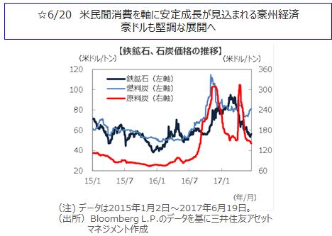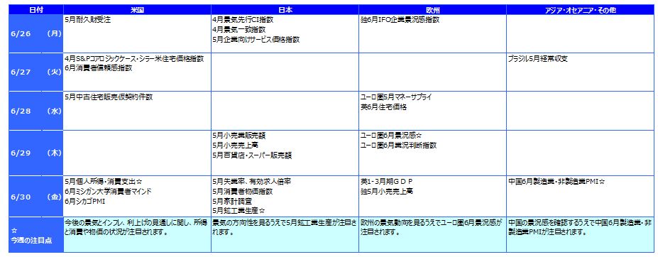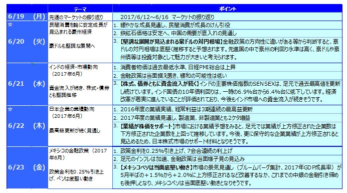 世界の株式市場は、全般的に小幅な動きとなりました。米国株式市場では、NYダウは週間では小幅上昇しました。週前半はダドリ-NY連銀総裁の強気の景気見通しなどを受けてハイテク株を中心に上昇しましたが、原油安などを嫌気して伸び悩みました。欧州株式市場は、フランスのマクロン大統領の共和国前進が過半数を獲得したことを好感して上昇して始まりましたが、原油安などを嫌気して下落、週間ではドイツ、英国ともに小幅下落しました。日本株式市場は、米国のハイテク株高や円安を受けて上昇、日経平均株価が20,000円台を回復しました。中国株式市場は、A株がMSCI新興株指数への採用が決まったことなどを好感して上昇しました。