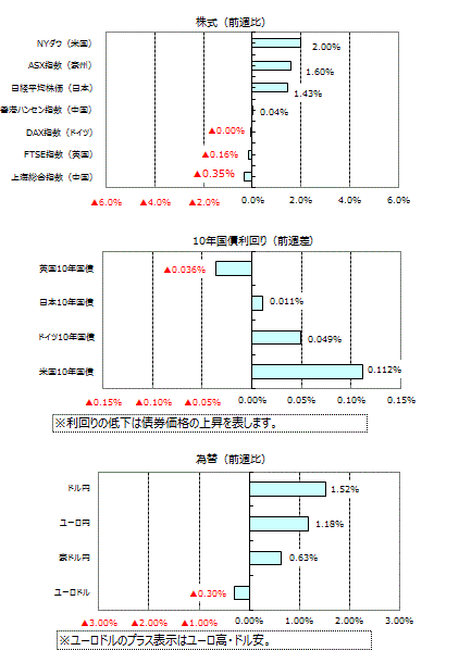 主要国の10年国債利回りは概ね上昇しました。米国の10年国債利回りは、2018年度の予算決議案の上院通過を受けた大型減税法案前進への期待やNYダウの上昇などを受けて、週間では0.112%上昇しました。ドイツの10年国債利回りは上昇、英国は低下しました。日本の10年国債利回りは小幅上昇しました。