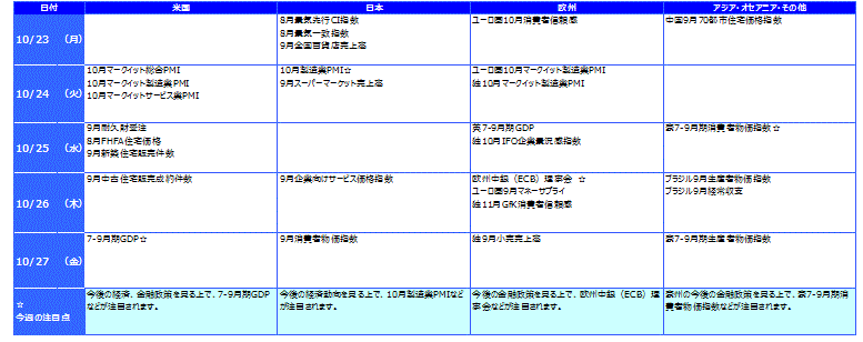 主要国の株式市場はまちまちとなりました。米国株式市場では、発表された経済指標や企業決算が総じて良好であったことや2018年度の予算決議案の上院通過などを好感して堅調に推移しました。週間ではNYダウは2.00%上昇し、最高値を更新しました。欧州株式市場では、世界的な株式市場の上昇傾向は好感されましたが、スペインのカタルーニャ自治州の独立問題の混迷を嫌気して伸び悩みました。英国のFTSE指数、独DAX指数はほぼ横這いとなりました。日経平均株価は、米国株の上昇や衆議院選挙で与党優位の観測が伝わったことなどを好感し上昇しました。過去最高の連騰記録と並ぶ14日連続の上昇となり、週間では1.43%上昇しました。中国株式市場では、香港ハンセン指数はほぼ横這い、上海総合指数は下落しました。