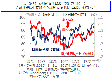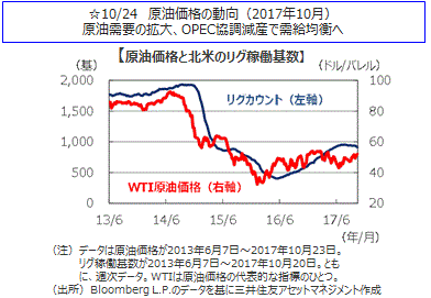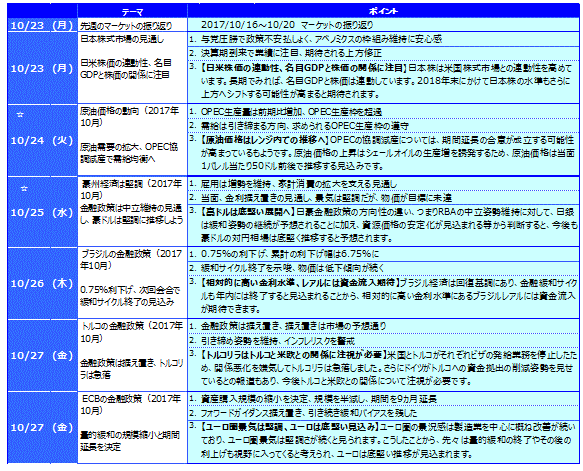 主要国の10年国債利回りはまちまちな動きとなりました。米国の10年国債利回りは、予算審議の進捗や9月の耐久財受注が好調であったことを受けて週間では0.022%上昇しました。ドイツの10年国債利回りはECBが量的緩和の終了に慎重な姿勢を示したため低下、英国は利上げ観測から小幅上昇しました。日本の10年国債利回りはほぼ横這いとなりました。