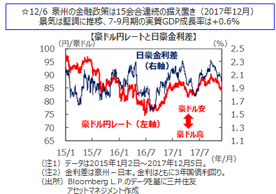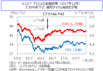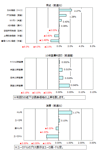 主要国の10年国債利回りは上昇しました。米国の10年国債利回りは、米上院・下院での税制改革法案早期一本化への期待やつなぎ予算が承認されたことなどからリスク選好が強まり、週間では0.015%上昇しました。ドイツの10年国債利回りはほぼ横ばい、英国の10年国債利回りは上昇しました。日本の10年国債利回りは上昇しました。