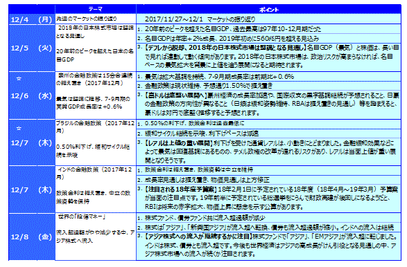 主要国の株式市場はまちまちとなりました。米国株式市場は、高値警戒感はあるものの、米上院・下院での税制改革法案早期一本化への期待やつなぎ予算が承認されたことなどを好感して上昇しました。週間ではNYダウは0.40%上昇し、最高値を更新しました。独DAX指数は、大連立協議が前進したことなどから、週間では2.27%上昇しました。英国FTSE指数は、ブレグジット協議の大筋合意が伝えられたことなどから週間では1.28%上昇しました。日経平均株価は、週前半は、中東情勢の緊迫化懸念などを受けて、6日に大幅下落するなど3日続落となりました。後半は、米上院・下院での税制改革法案早期一本化への期待やNY株高などを好感して上昇し、週間ではほぼ横ばいとなりました。中国株式市場では、当局による引き締め懸念などから上海総合指数は下落、香港ハンセン指数も下落しました。