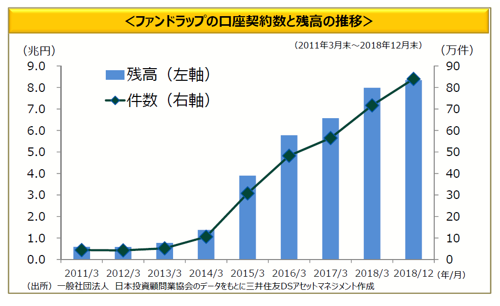 ⽇本国内のファンドラップ⼝座の残⾼と契約件数は2014年以降⼤きく拡⼤しています。2018年12⽉末時点では、純資産残⾼は約8兆円超、契約件数は約84万件となっています。