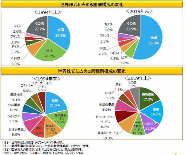 25年前と⽐較すると、⽶国企業の構成⽐率が⼤幅に増加した⼀⽅、他国の構成⽐率は概ね低下してきています。また、業種別でみると情報技術分野が2019年末のトップとなっているほか、企業の時価総額ランキングにも多くのIT関連企業が上位に⼊るなど、産業構造が変化しつつ