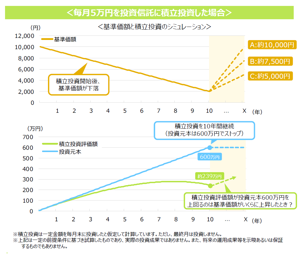 投資信託に積⽴投資を⾏っているとき、保有する投資信託の基準価額が⼤きく下がると、不安に感じ、解約を検討することもあるかもしれません。例えば、毎⽉投資信託に5万円を積⽴投資していたものの、積⽴開始時は10,000円だった基準価額が積⽴投資開始10年⽬に2,000円まで下がってしまったとします。その後、基準価額が上昇に転じたと仮定した場合、基準価額がいくらまで上昇すれば、積み⽴てた投資信託の評価⾦額が投資元本を上回るでしょうか。