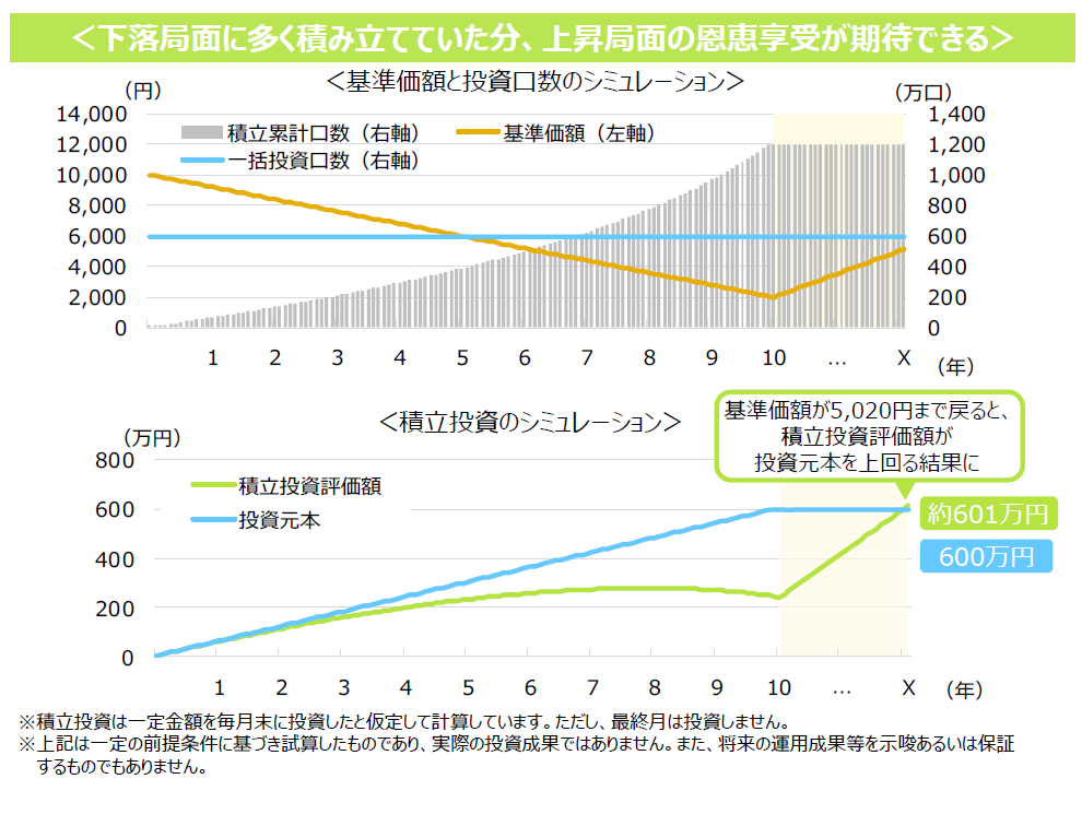 もし、投資開始時に600万円を⼀括投資した場合、投資⼝数は相場環境に関わらず⼀定となりますが、積⽴投資の場合は基準価額が下落している局⾯で⼝数を多く購⼊することが出来るため、基準価額が約5,000円に戻った段階で、投資元本を確保することができます。さらに、基準価額が10,000円まで戻れば、積⽴投資評価額は約1,200万円まで上昇します。