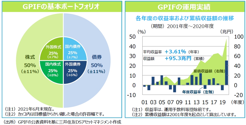 ⽇本の公的年⾦(厚⽣年⾦保険と国⺠年⾦)の運⽤を担っているのがGPIF(年⾦積⽴⾦管理運⽤独⽴⾏政法⼈)です。その運⽤資産総額は約186兆円(2021年3⽉末現在)にのぼり、「世界最⼤級の年⾦基⾦」となっています。GPIFは、インフレやデフレをはじめとする様々な運⽤環境の下で、⻑期にわたり安全かつ効率的に年⾦積⽴⾦を運⽤するため、「分散投資」を⾏っています。「分散投資」は、複数の資産を組み合わせて運⽤を⾏うことで、投資におけるリスクを低減させるための⽅法として、広く知られています。