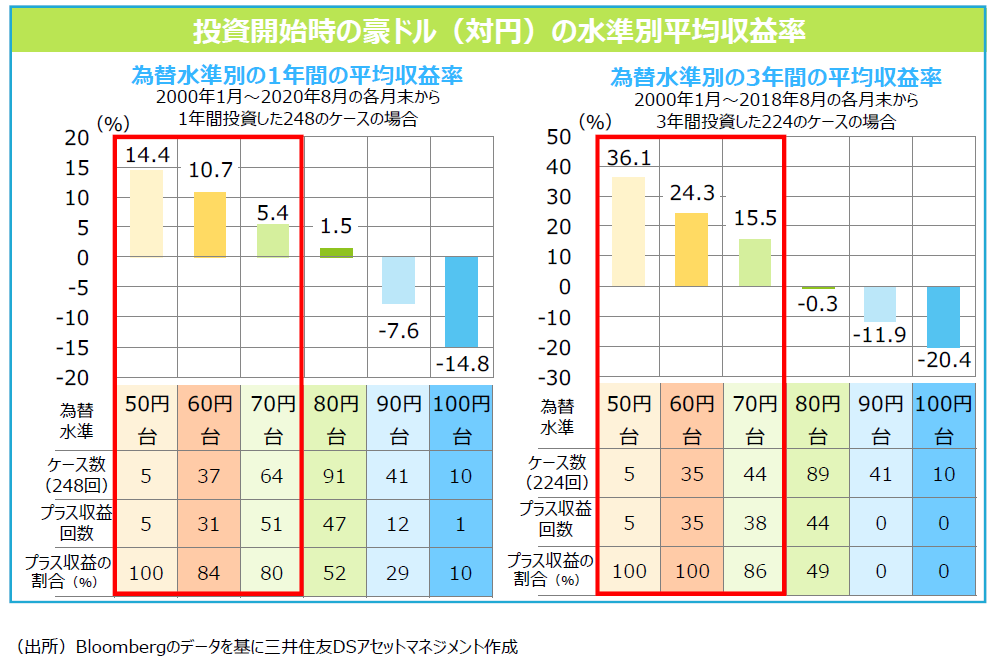 為替レートの⽔準に着⽬し、過去1年間および3年間の投資を⾏った場合の収益率は、1豪ドルが80円を下回る局⾯において⽐較的良好でした。