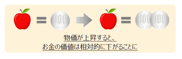 インフレーション(インフレ)とは、モノの値段(物価)が上昇し続ける状態のことで、お⾦の価値が相対的に下がる状態を指します。例えば、リンゴの値段が100円から200円に上昇した場合、同じリンゴを購⼊するのに必要なお⾦が2倍になる、つまりお⾦の価値が2分の1になったと⾔えます。