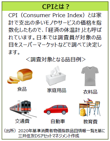 インフレ状況を把握するために多くの国で⼀般的に採⽤されている指標が消費者物価指数(CPI)です。相対的に価格変動の⼤きい⾷品やエネルギー価格を除外して算出されたCPIも公表されています。