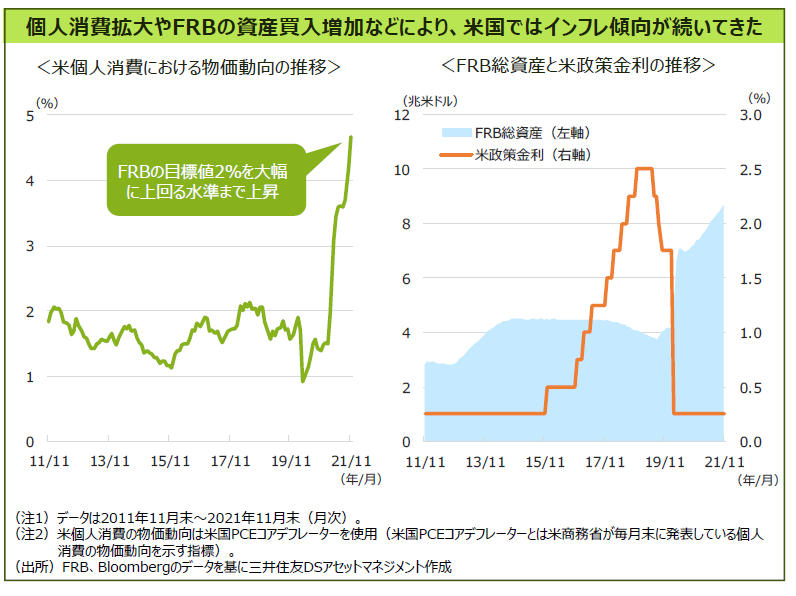 ⽶国では、新型コロナウイルスのワクチン接種拡⼤によって経済活動が再開し個⼈消費が拡⼤したことや、原材料費や⼈件費が⾼騰していることなどから、⾜元でインフレ傾向が続いてきました。