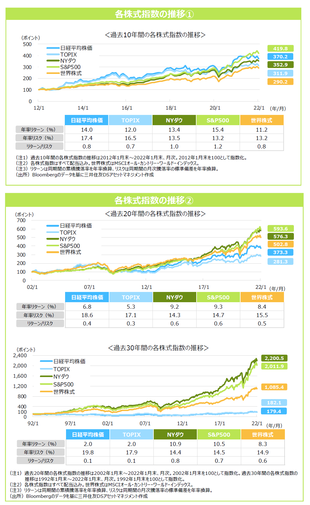 過去10年間、20年間、30年間にわたって国内外の株式を保有した場合、いずれの期間においても⽶国株への投資成果が最も⾼くなりました。また、過去30年間の投資成果は振るわなかった⽇本株も、アベノミクス以降の上昇によって、過去10年間のリターンは世界株式を上回っています。