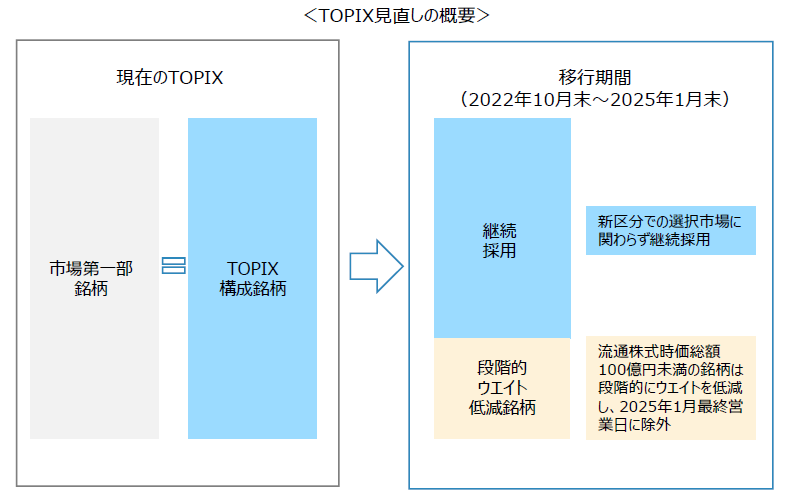 ●2022年4⽉1⽇の構成銘柄については、新市場区分施⾏後の同年4⽉4⽇以降も選択市場に関わらず継続採⽤されます。ただし、流通株式時価総額100億円未満の銘柄については「段階的ウエイト低減銘柄」とし、2022年10⽉末から2025年1⽉末まで、四半期ごとに10段階で構成⽐率を低減していきます。