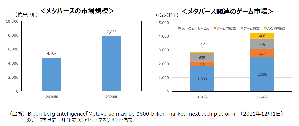 メタバース市場は2020年の4,787億⽶ドルに対し、2024年には7,833億⽶ドルに達する可能性があり、年平均成⻑率は13.1%という予測があります。このうち、ソフトウェアやハードウェア、広告などを合わせたゲーム関連は市場規模の約70%を占めており、⼤きく拡⼤することが予測されています。
