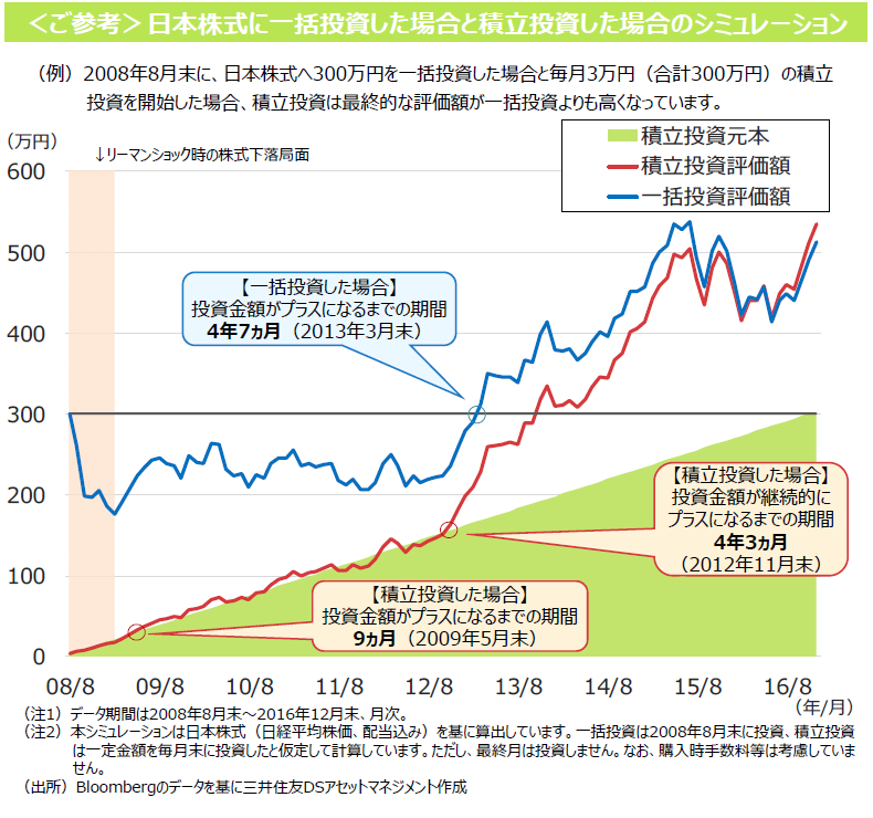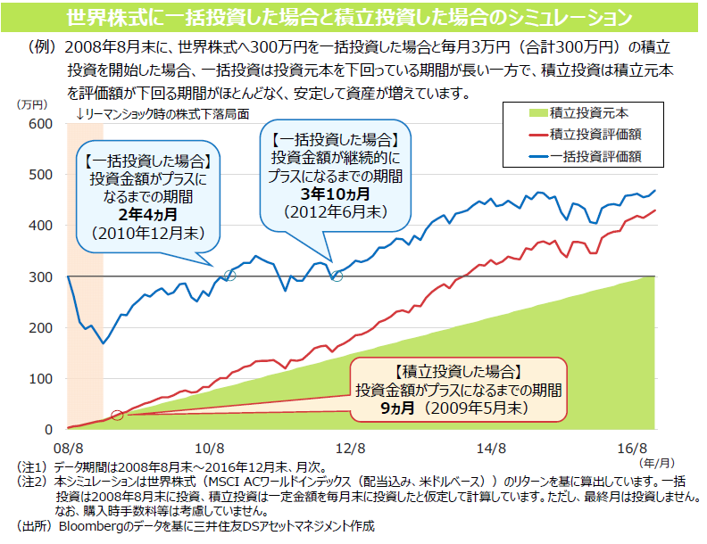 例えばリーマンショック発⽣時には、世界株式が発⽣前の⽔準に戻るまで2年4ヵ⽉かかりましたが、仮に世界株式の積⽴投資をリーマンショック直前から⾏っていた場合、投資⾦額は9ヵ⽉後に投資元本を上回りました。