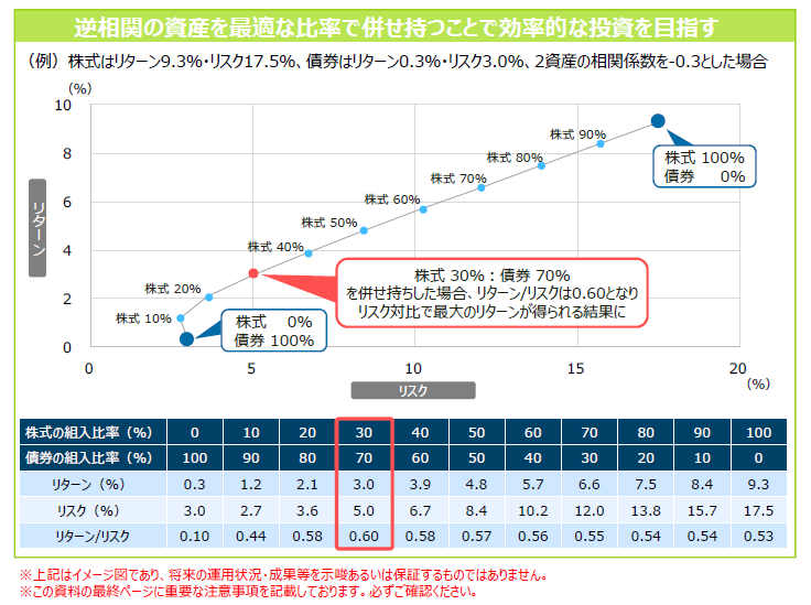 例えば相関係数が-0.3(負の相関)の株式と債券を併せ持つ場合、それぞれの保有⽐率によってリターン、リスク(標準偏差)の数値が変化します。下グラフでは、株式を30%、債券を70%保有していた場合にリターン/リスク値が最も⾼くなることから、リスク対⽐で最⼤のリターンを得られる(効率よく収益が得られる)ことが期待されます。