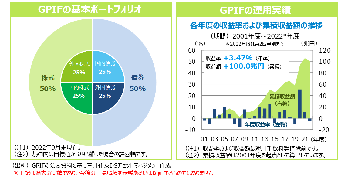 2022年度の運用実績(収益額)は、主要先進国の金融引締めによる景気後退への警戒感等から主に国内外の株式市場が下落した影響を受け第1、第2四半期ともにマイナスとなり、第2四半期までで▲5兆4,721億円となりました。2001年度(市場運用開始)以降の累積収益額は約100.0兆円にのぼっています。