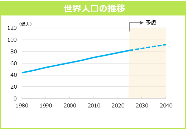 世界人口は2020年の約78億人から2030年に約85億人、20年後の2040年には約92億人にまで増加すると予想されており、今後も世界の経済成長が続くと見込まれます。