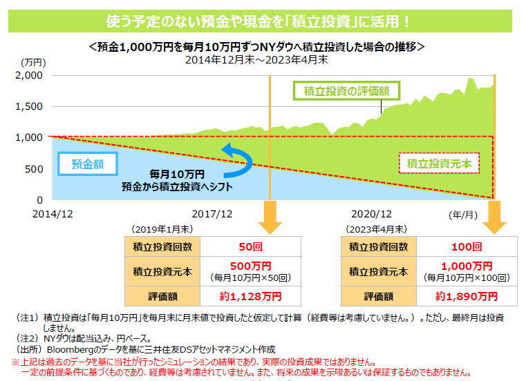 「積⽴投資」というと、毎⽉の収⼊で積⽴てをするものと考える⽅が意外にも多いようです。しかし、新規のお⾦を⽤意するだけではなく、使う予定のない預⾦や現⾦を少しずつ積⽴投資にシフトすることも可能です。「貯蓄から投資へ」を「預⾦から積⽴投資」で実践してみましょう。