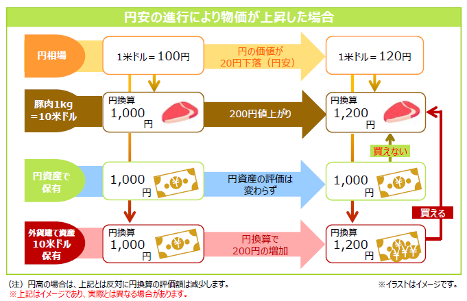 1kg=10⽶ドルの豚⾁を輸⼊した場合、豚⾁価格は1⽶ドル=100円の時には円換算で1,000円ですが、1⽶ドル=120円の時には1,200円に値上がりしてしまいます。円安が進むと当初の1,000円で豚⾁は購⼊できず、同量の豚⾁を買うためには、お⾦を追加して払わなければなりません。しかし、外貨建て資産で保有した場合には、円安によって円換算の価値が増加するため、お⾦を追加しなくても値上がりした豚⾁を購⼊することができます。