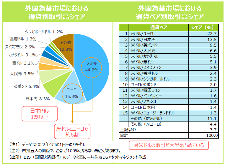 外国為替市場では、米ドルの取引高が全体の約44%を占めています。通貨ペア(通貨の組合せ)で見ると、対米ドルの取引は全体の約88%となっています。