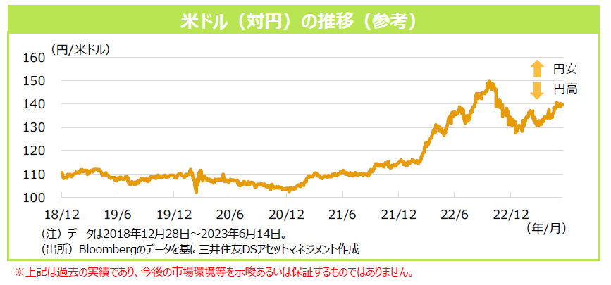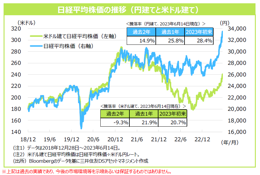 2022年3月以降の円安の進行により、米ドル建てでみた日経平均株価は、期間によっては日経平均株価(円建て)ほどのパフォーマンスとはなっていません。