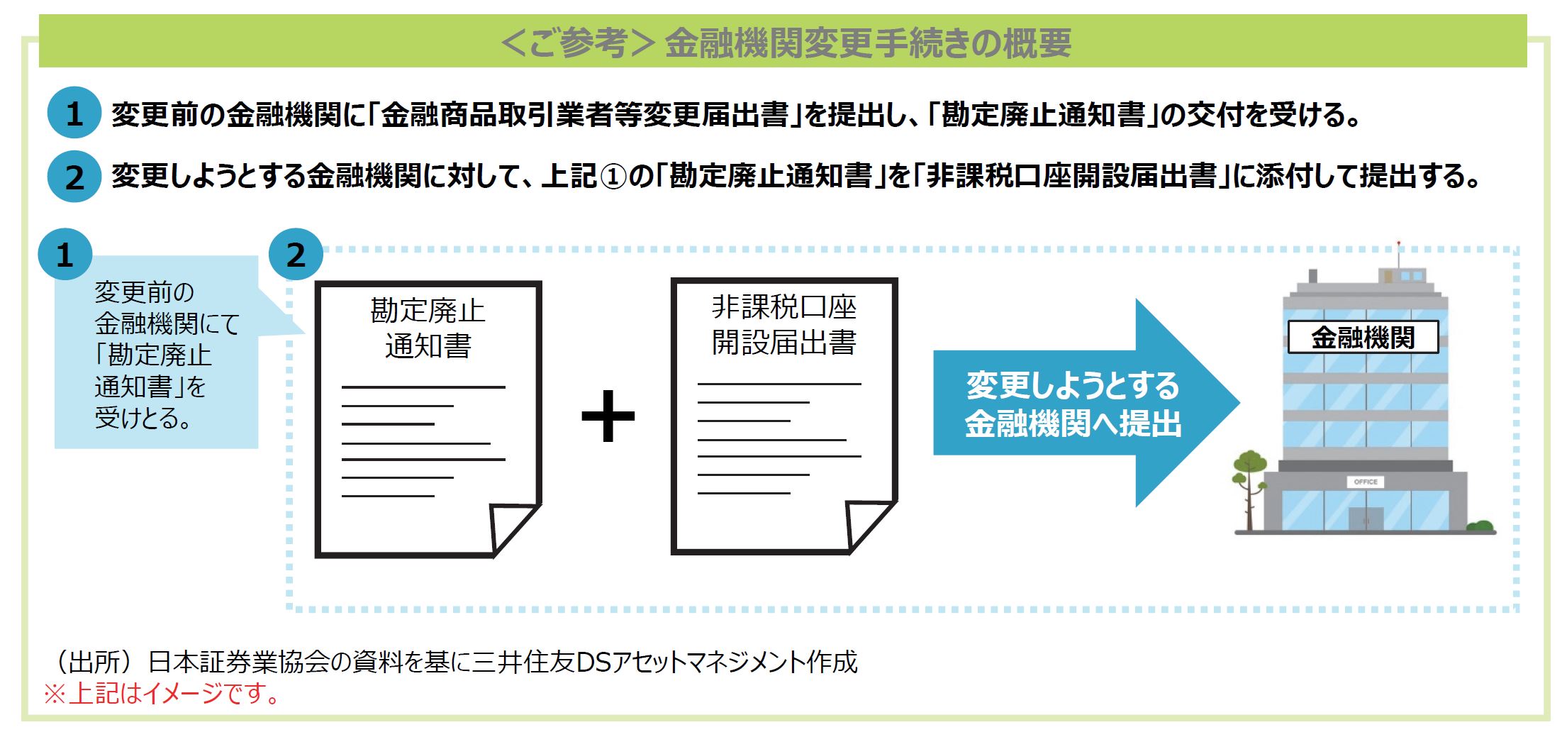 ■2023年中に買付けしていない場合は、2023年9⽉末までに現⾏NISA⼝座の⾦融機関の変更⼿続きを完了させることで、2024年1⽉に⾃動的に変更後の⾦融機関で新しいNISA⼝座が開設される予定です。また、9⽉末までに⼿続きを⾏わなかった場合には、買付けした場合と同様に、2024年に利⽤する新しいNISA⼝座の⾦機機関の変更として、10⽉以降に⼿続きできる予定です。