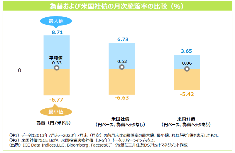 - 過去の⽶国社債(円ベース、為替ヘッジなし)の⽉次騰落率と為替(円/⽶ドル)の⽉次騰落率を⽐較すると、為替(円/⽶ドル)が最⼤で約9%程度変動しているのに対し、⽶国社債(円ベース、為替ヘッジなし)は最⼤で約7%程度の変動となっています。