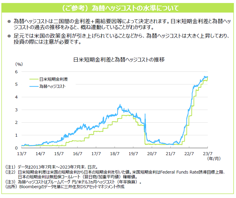 - ただし、為替ヘッジを⾏う際にはヘッジコストがかかります。為替ヘッジコストの⽔準によっては、社債運⽤によるリターンよりもコストの⽅が⾼くなる場合もあるため、注意が必要です。