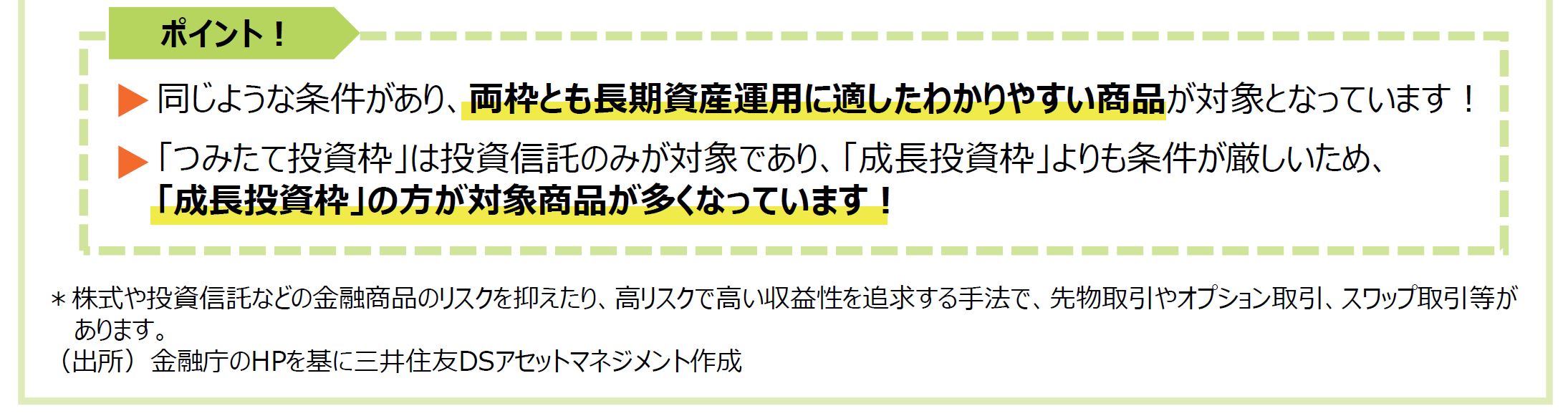 ただし、「つみたて投資枠」と「成⻑投資枠」では対象商品が異なるため、同じ商品で積⽴投資を継続できない場合があります。「成⻑投資枠」でしか投資できない商品を積⽴投資するのも良いかもしれません。(詳しくは下部のご参考へ)