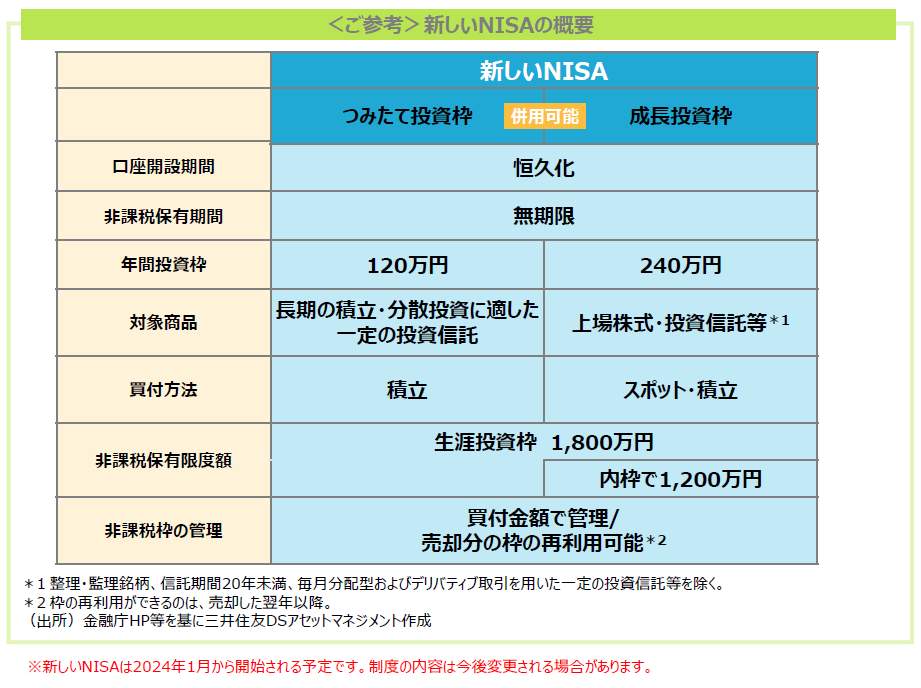 2024年1月から開始する新しいNISAは、非課税保有期間が無期限となり、年間投資枠や非課税保有限度額が拡大し、さらに売却分の枠の再利用が可能*となるなど、より利便性の高い制度に生まれ変わります。