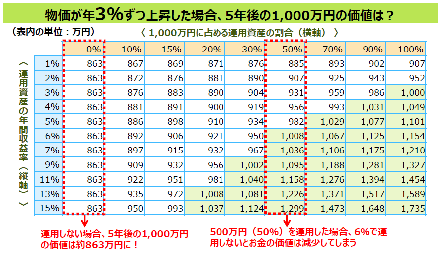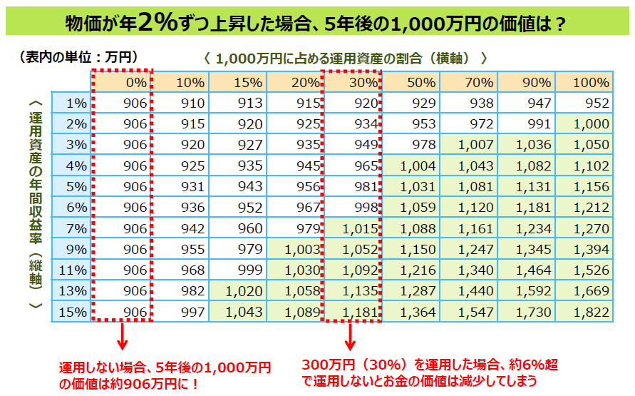 仮に、物価が継続的に年2%上昇する中、何も対処しなかった場合には、実質的なお金の価値は減少してしまいます。こうしたお金の価値の減少への対処方法の一つとして資産運用があります。ただし、金融資産に占める「運用資産の割合」によって、お金の価値を維持するための「年間収益率(必要な利回り)」は変わってきますので、「運用資産の割合」を考えていくことが重要です。