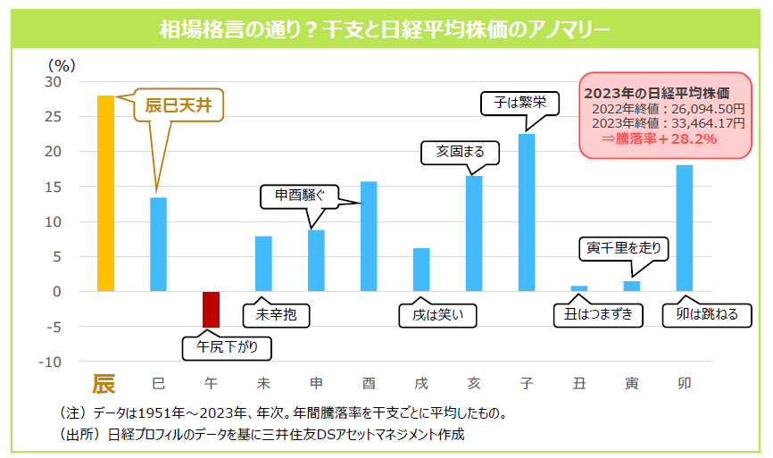 ◆株式市場には、昔から⾔い伝えられてきた、相場に対する⼼構えや相場の⾒⽅、投資家⼼理などを表した様々な「相場格⾔」があります。経験則に基づく株式市場の法則(アノマリー)等もその⼀つです。⼲⽀と株式市場のアノマリーを⽰した代表的なものとして、「⾠⺒(たつみ)天井、午(うま)尻下がり、未(ひつじ)⾟抱、申⾣(さるとり)騒ぐ、戌(いぬ)は笑い、亥(い)固まる、⼦(ね)は繁栄、丑(うし)はつまずき、寅(とら)千⾥を⾛り、卯(うさぎ)は跳ねる。」という相場格⾔があります。
