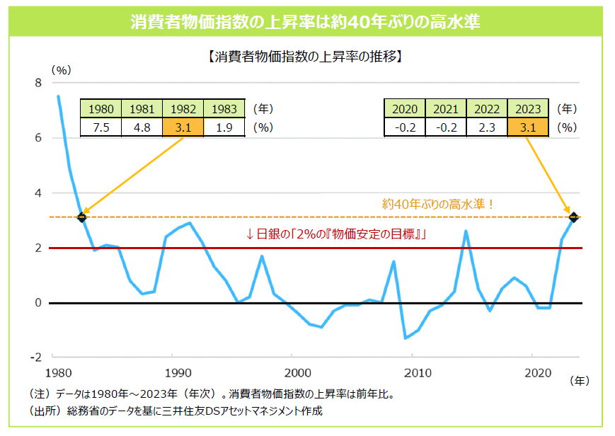 ◆2023年の消費者物価指数(生鮮食品除く総合、以下同)は前年比+3.1%の上昇となりました。これは1982年以来、実に約40年ぶりの水準です。日本銀行(以下、日銀)は、2013年に「2%の『物価安定の目標』」を掲げ、消費者物価指数の上昇率で同+2%をできるだけ早期に実現すると約束をしています。そのため、異次元の金融緩和ともいわれる、大規模な金融緩和政策が継続されてきました。