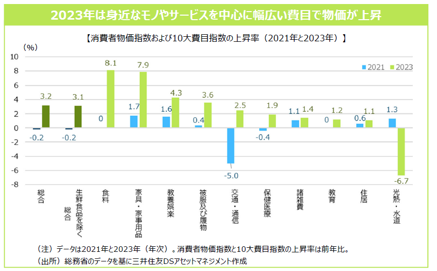 消費者物価指数の上昇率は約40年ぶりの高水準です。具体的な費目をみると、2023年は身近な食料などを中心に幅広くモノやサービスの価格が上昇しました。