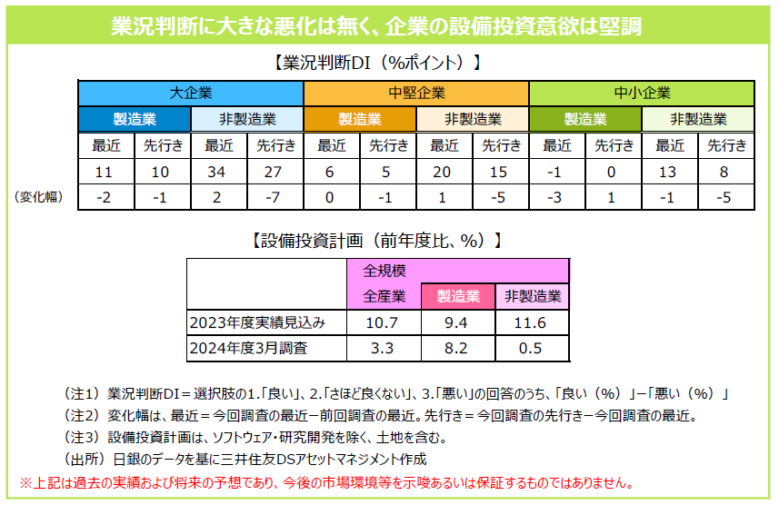 「日銀短観」によると、製造業に一時的な下押し要因があるものの、総じて景気の崩れはみられません。また、企業の設備投資への意欲は引き続き堅調です。