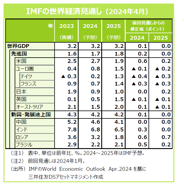 ◆ 国際通貨基金(IMF)が2024年4月に公表した世界経済見通しによると、世界のGDP成長率は、2024年、2025年はともに+3.2%と、2023年と同ペースでの成長が見込まれています。先進国のGDP成長率は、2024年に1.7%、2025年に1.8%とやや加速するものの、新興・発展途上国は2023年の4.3%から2024年と2025年に4.2%へ小幅に減速することで、先進国の成長加速を相殺する見込みです。