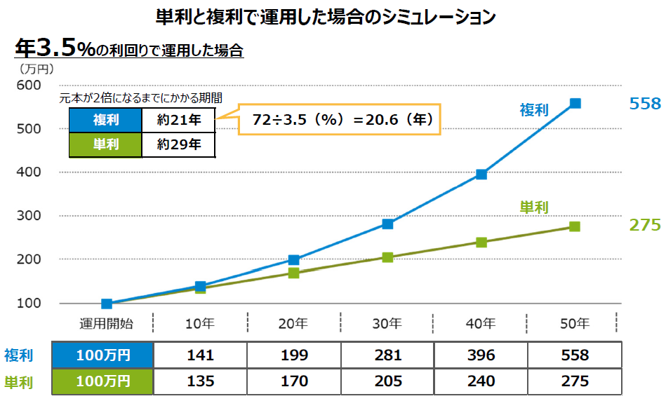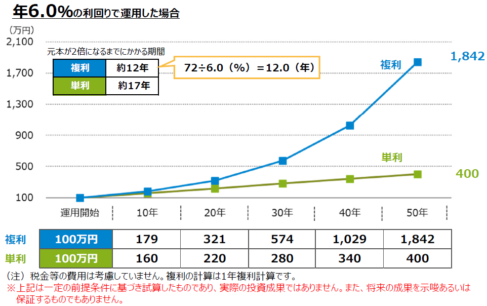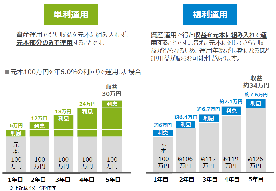 複利運⽤は運⽤で得た収益を再投資することで、収益が収益を⽣んで資産が膨らんでいく効果が期待されるため、単利で運用するよりも⾼い利益が得られる可能性があります。