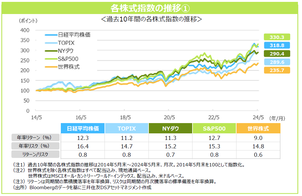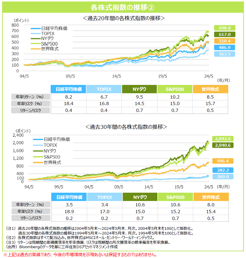 ◆過去10年間、20年間、30年間にわたって国内外の株式を保有した場合の投資成果(現地通貨ベース、世界株式のみ米ドルベース)を比較してみると、いずれの期間においても米国株式のパフォーマンスが最も高くなりました。国内株式はバブル崩壊後の低迷期の影響により過去30年間の投資成果は振るわなかったものの、アベノミクス以降の上昇によって、過去20年間では日経平均株価は世界株式と概ね同程度となりました。さらに、2023年以降の上昇により、過去10年間では国内株式は世界株式を上回る投資成果となり、なかでも日経平均株価は米国株式と肩を並べる結果となりました。