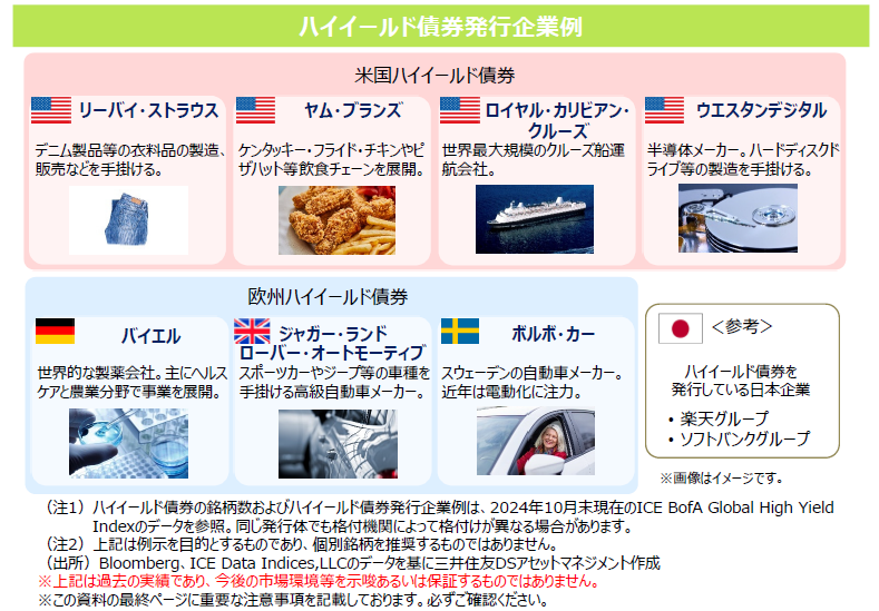 ◆ハイイールド債券の発⾏企業の中には、現在成⻑段階にある企業だけでなく、過去の経営不振などが原因で格付けが引き下げられた⼤企業なども存在していますが、その後の業績回復によって格付けが引き上げられる場合もあります。