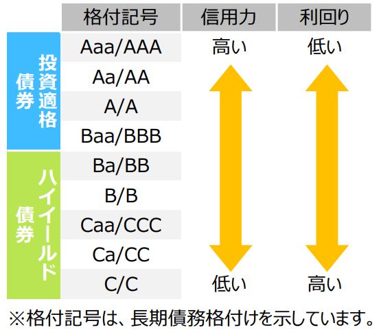 ◆⼀般的に、格付けが低い(Ba/BB格相当以下)債券をハイイールド債券といいます。投資適格社債と⽐べ、発⾏体の信⽤⼒が低い⼀⽅、利回りが⾼いという特徴があります。