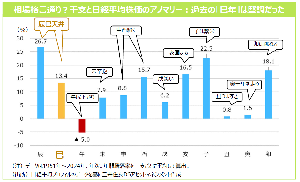 ◆相場格言はその時々の相場環境によって、当てはまる場合もあれば、そうでない場合もあります。2025年の日本株式市場は、辰年の2024年に次ぐ賃上げ動向や、「年収103万円の壁」とも言われる税制等の改正、石破政権による景気配慮型の財政政策の効果などが期待されるほか、米国のトランプ第二次政権の政策効果がいかに日本に影響するのか注目されます。*日経平均株価は日本経済新聞社の著作物です。