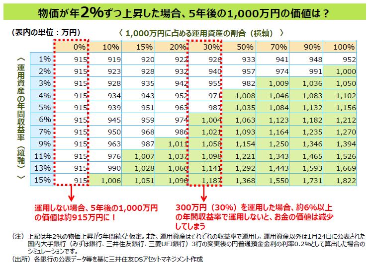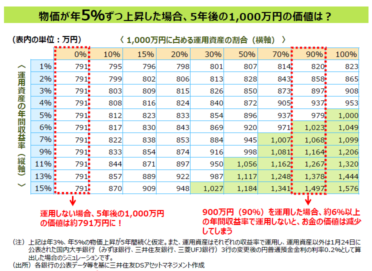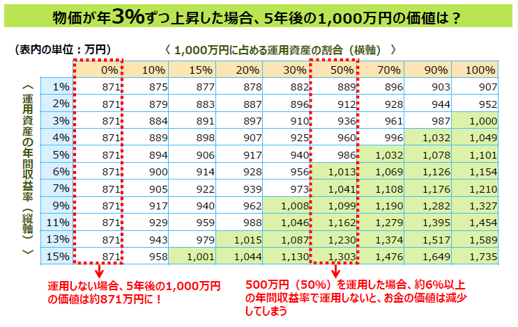 対処方法の一つに資産運用があります。お金の価値を維持するために、金融資産に占める「運用資産の割合」と「必要な利回り」を考えていきましょう。
