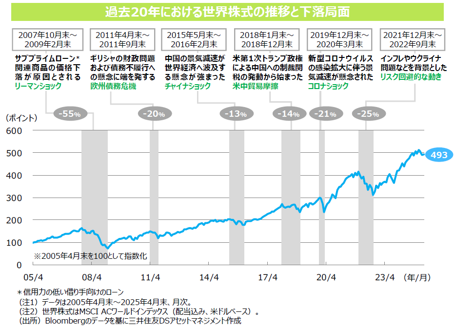 過去20年において世界株式は、下落局⾯の後に上昇し、下落前の⽔準を回復して上昇傾向を⽰しました。