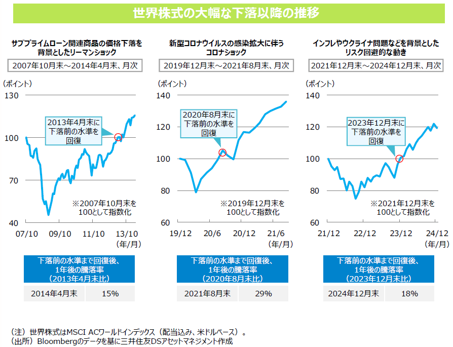 これまで世界の株式市場では、リーマンショック、チャイナショックやコロナショックなど、いくつもの下落局⾯がありましたが、⼀時的に⼤きく下落した後は反転して上昇しています。下落前の⽔準を回復するには数年程度を要する場合もありましたが、⻑期的には下落前の⽔準を回復し上昇傾向を⽰しました。