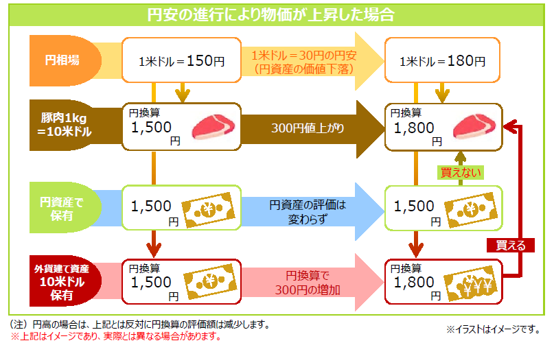 ◆例えば1kg=10米ドルの豚肉を輸入した場合、豚肉価格は1米ドル=150円の時には円換算で1,500円ですが、1米ドル=180円となると1,800円に値上がりしてしまいます。円安が進むと当初の1,500円では購入できず、同量の豚肉を買うためには、お金を追加して支払わなければなりません。しかし、外貨建て資産を保有した場合には、円安によって円換算の価値が増加するため、お金を追加しなくても値上がりした豚肉を購入することができます。