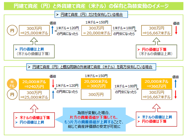 ◆円建てと外貨建ての両⽅の資産を保有すると、円⾼・円安いずれの局⾯でも、それぞれの実質的な資産価値がプラス/マイナスに変動するため、総じて資産の評価額を安定させることが可能と考えられます。