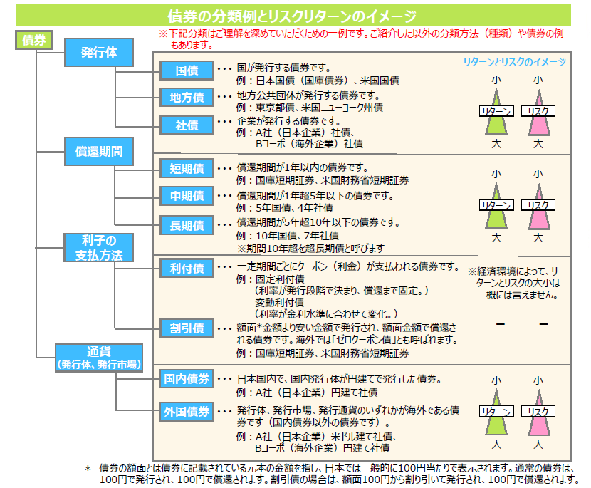 債券には、発行体、償還期間、利子の支払方法、通貨などの違いにより様々な種類があります。