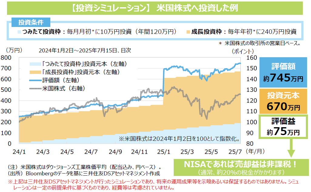 2024年1⽉に「⽇本株式」、「⽶国株式」へそれぞれ投資を始めたと仮定してシミュレーションをしてみると、⽇本、⽶国ともに株式市場が下落する局⾯もありましたが、評価益が出ています(2025年7⽉15⽇現在)。